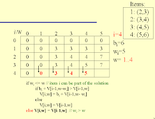 Note on run time: Clearly the run time of this algorithm is O(nW), based on the nested loop structure and the simple operation inside of both loops. When comparing this with the previous O(2n), we find that depending on W, either the dynamic programming algorithm is more efficient or the brute force algorithm could be more efficient. (For example, for n=5, W=100000, brute force is preferable, but for n=30 and W=1000, the dynamic programming solution is preferable.)