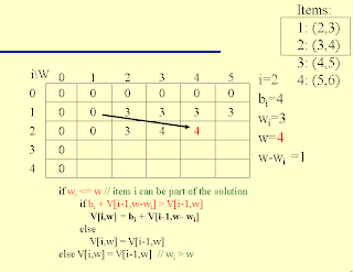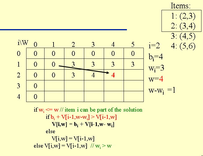 K\[i\]\[w\] = Math.max(val\[i-1\] + K\[i-1\]\[w-wt\[i-1\]\], K\[i-1\]\[w\]);