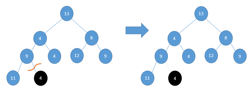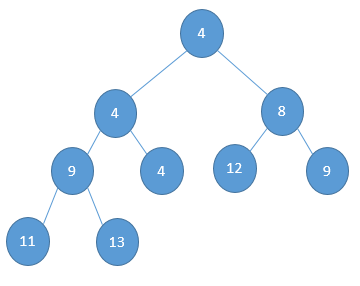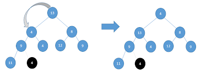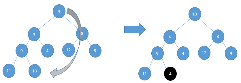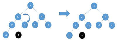 But still the heap property is not restored, as 13 is larger than both 9 and 4. So we bubble it down again.
