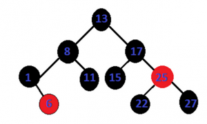 Let’s delete the node 25 from above red black tree. Since node 25 is red and it’s left child 22 and right child 27 is black, that is case1. After handling case1 now the f points to node 25 and current node, q points to node 22 (inorder predecessor of node 25). Now we replace the data of node pointed by f with data of node pointed by q. After the deletion of node 25 the tree look like this: