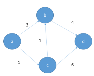 Now, here the shortest path from a to d, is a,c,b, d with the total length of 6, though we go zig zag, all the other routes are not good, like a TO c TO d leads 7 and similarly a TO b TO d leads 7 :