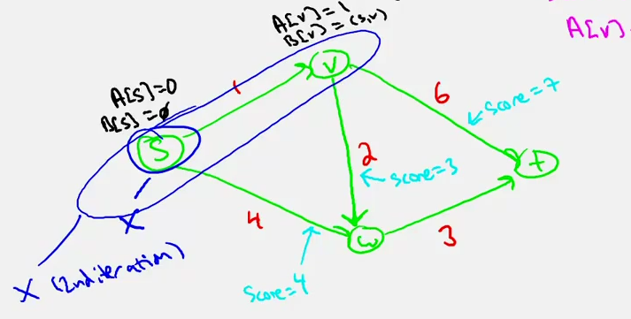 Now we use Djikstra’s greedy score for u,w such that new score = A[v]+lvw. From s, we have 2 paths - s-v and s-w. Lets |d| we use as shortest distance of s to other vertex. |s-v| = 1 and |s-w| = 4. Following the greedy approach, we decide that we choose |s-v| as it has smaller amount. So, now A[v] = 1 i.e. the shortest distance currently and B[v] = (s,v) which has corresponding path.