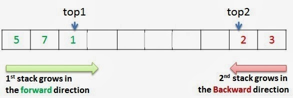This method efficiently utilizes the available space. It doesn’t cause an overflow if there is space available in arr[]. The idea is to start two stacks from two extreme corners of arr[]. stack1 starts from the leftmost element, the first element in stack1 is pushed at index 0. The stack2 starts from the rightmost corner, the first element in stack2 is pushed at index (n-1). Both stacks grow (or shrink) in opposite direction.