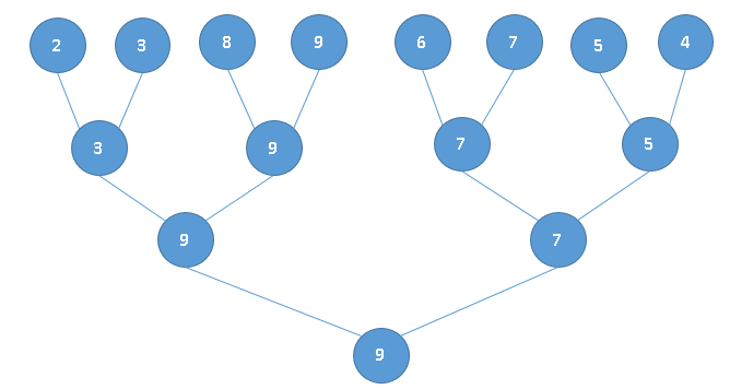 So, looking at the tree above, 9 is the winner, but we find 2nd winner on level 2 and so on.